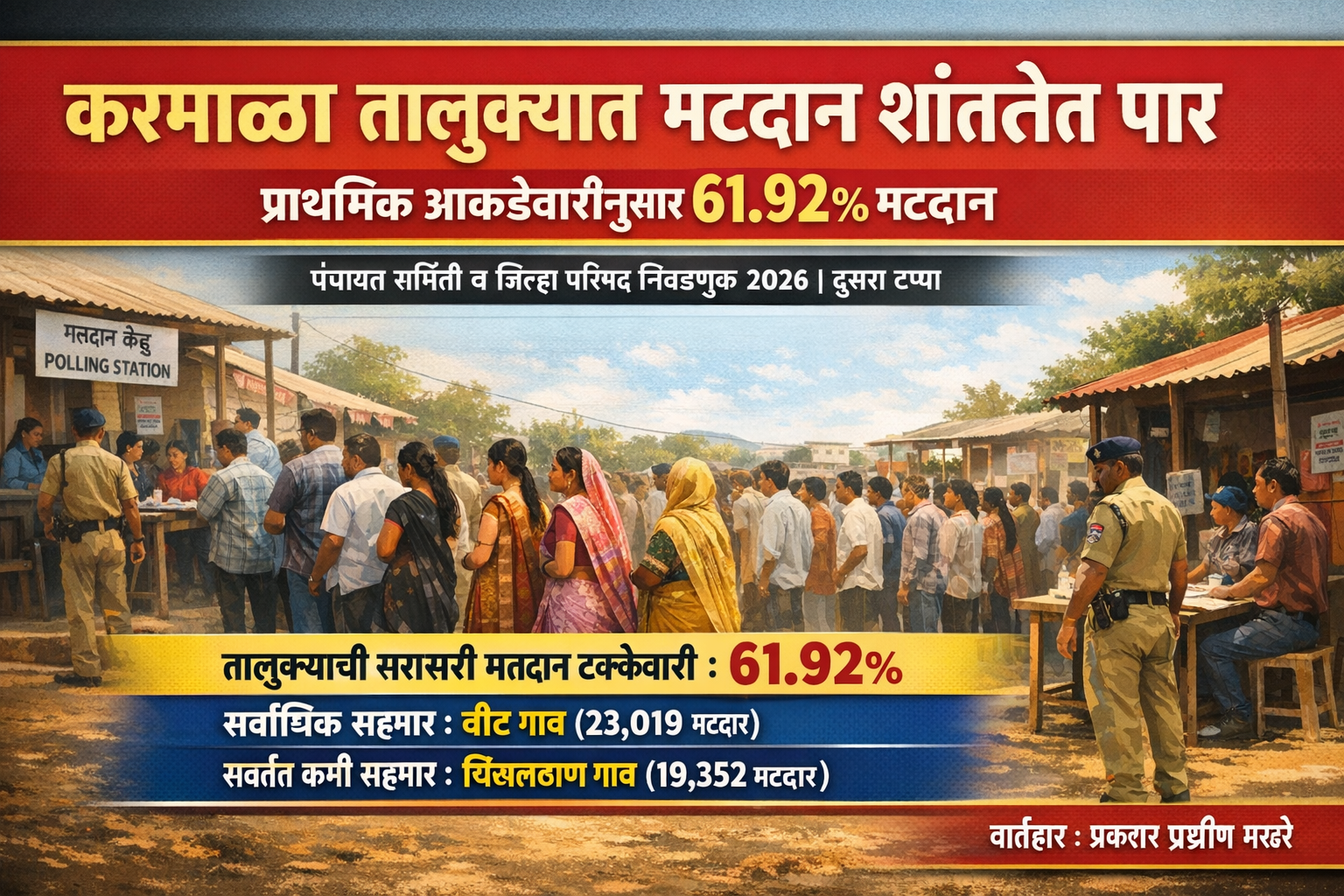 करमाळा तालुक्यात पंचायत समिती व जिल्हा परिषद निवडणुकीसाठीचे मतदान आज शांततेत आणि शिस्तबद्ध वातावरणात पार पडले.