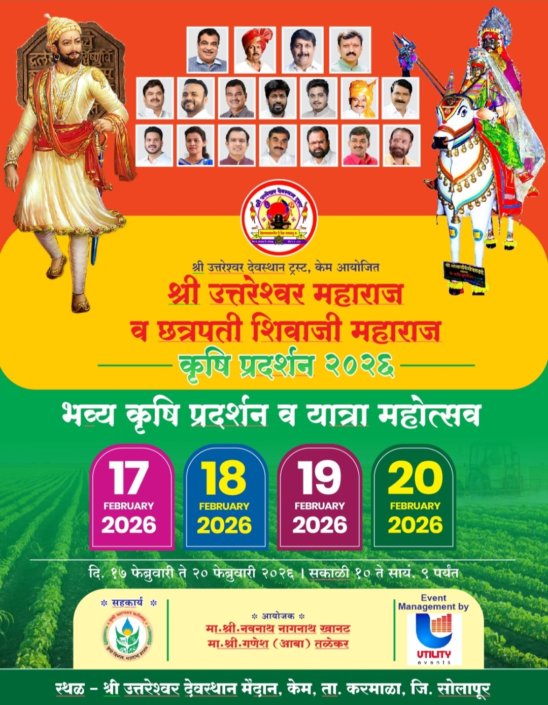 सोलापूर जिल्ह्यातील करमाळा तालुक्यातील केम येथे १७ ते २० फेब्रुवारी २०२६ या कालावधीत ‘श्री उत्तरेश्वर महाराज व छत्रपती शिवाजी महाराज कृषी प्रदर्शन व यात्रा महोत्सव’ आयोजित करण्यात आला आहे. श्री उत्तरेश्वर देवस्थान ट्रस्टच्या वतीने होणारे हे प्रदर्शन आधुनिक शेती तंत्रज्ञान, शेतीपूरक व्यवसाय आणि बाजारपेठ जोडणी यांचा संगम घडवणारे ठरणार आहे.