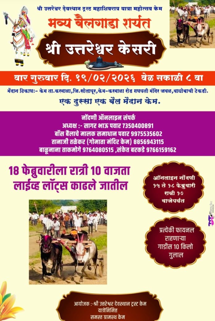 рд╕реЛрд▓рд╛рдкреВрд░ рдЬрд┐рд▓реНрд╣реНрдпрд╛рддреАрд▓ рдХрд░рдорд╛рд│рд╛ рддрд╛рд▓реБрдХреНрдпрд╛рддреАрд▓ рдХреЗрдо рдпреЗрдереЗ рдорд╣рд╛рд╢рд┐рд╡рд░рд╛рддреНрд░ рдпрд╛рддреНрд░реЗрдирд┐рдорд┐рддреНрдд рдЖрдпреЛрдЬрд┐рдд рдХрд░рдгреНрдпрд╛рдд рдЖрд▓реЗрд▓реА рднрд╡реНрдп рдмреИрд▓рдЧрд╛рдбрд╛ рд╢рд░реНрдпрдд тАУ тАШрд╢реНрд░реА рдЙрддреНрддрд░реЗрд╢реНрд╡рд░ рдХреЗрд╕рд░реАтАЩ рд╕реНрдкрд░реНрдзрд╛ рдпрдВрджрд╛ рдЕрднреВрддрдкреВрд░реНрд╡ рдЙрддреНрд╕рд╛рд╣рд╛рдд рдкрд╛рд░ рдкрдбрдгрд╛рд░ рдЖрд╣реЗ. рдЧреБрд░реБрд╡рд╛рд░ рджрд┐. резреп рдлреЗрдмреНрд░реБрд╡рд╛рд░реА реирежреирем рд░реЛрдЬреА рд╕рдХрд╛рд│реА рео рд╡рд╛рдЬрддрд╛ рдпрд╛ рдмрд╣реБрдЪрд░реНрдЪрд┐рдд рд╢рд░реНрдпрддреАрд▓рд╛ рдкреНрд░рд╛рд░рдВрдн рд╣реЛрдгрд╛рд░ рдЕрд╕реВрди рдкрд░рд┐рд╕рд░рд╛рдд рдпрд╛рддреНрд░реЗрдЪреЗ рд╡рд╛рддрд╛рд╡рд░рдг рд░рдВрдЧреВ рд▓рд╛рдЧрд▓реЗ рдЖрд╣реЗ.