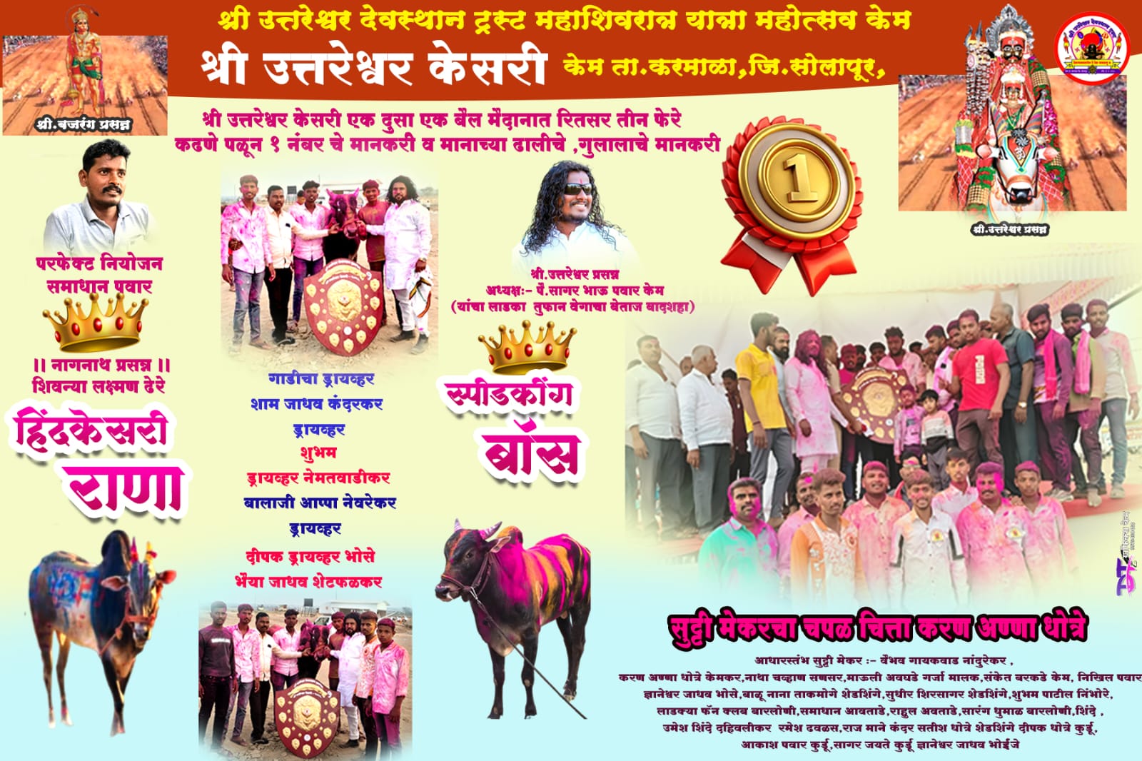 рд╕реЛрд▓рд╛рдкреВрд░ рдЬрд┐рд▓реНрд╣реНрдпрд╛рддреАрд▓ рдХрд░рдорд╛рд│рд╛ рддрд╛рд▓реБрдХреНрдпрд╛рддреАрд▓ рдХреЗрдо рдпреЗрдереЗ рдорд╣рд╛рд╢рд┐рд╡рд░рд╛рддреНрд░ рдпрд╛рддреНрд░реЗрдирд┐рдорд┐рддреНрдд рдЖрдпреЛрдЬрд┐рдд рдХрд░рдгреНрдпрд╛рдд рдЖрд▓реЗрд▓реНрдпрд╛ рднрд╡реНрдп рдмреИрд▓рдЧрд╛рдбрд╛ рд╢рд░реНрдпрддреАрдд тАШрдмреЙрд╕-рдмрд╛рдЬреАтАЩ рдпрд╛ рджрдорджрд╛рд░ рдмреИрд▓рдЬреЛрдбреАрдиреЗ рдореИрджрд╛рди рдЧрд╛рдЬрд╡рдд рдкреНрд░рдердо рдХреНрд░рдорд╛рдВрдХ рдкрдЯрдХрд╛рд╡рд▓рд╛. рдпрд╛ рд╡рд┐рдЬрдпреА рдЧрд╛рдбреНрдпрд╛рдЪреЗ рдорд╛рд▓рдХ рдХреЗрдо рдпреЗрдереАрд▓ рд╕рдорд╛рдзрд╛рди рдкрд╡рд╛рд░ рдЕрд╕реВрди рддреЗрдВрднреБрд░реНрдгреА (рддрд╛. рдорд╛рдврд╛) рдпреЗрдереАрд▓ рдХреБрдорд╛рд░ рднрд╛рдирд╡рд╕реЗ рдпрд╛рдВрдЪреНрдпрд╛ тАШрдмреЙрд╕тАЩ рд╡ тАШрдмрд╛рдЬреАтАЩ рдпрд╛ рдЬреЛрдбреАрдиреЗ рд╡реЗрдЧрд╛рдЪреА рдкрд░рд╛рдХрд╛рд╖реНрдард╛ рджрд╛рдЦрд╡рдд рд╕реНрдкрд░реНрдзреЗрдд рдмрд╛рдЬреА рдорд╛рд░рд▓реА.